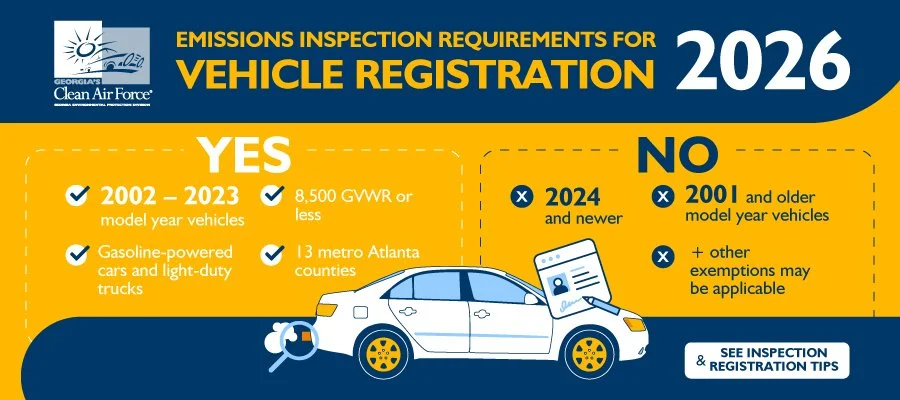 For 2026 vehicle registration, if your vehicle is a 2002 – 2023 model year gasoline-powered car or light-duty truck (8,500 pounds gross vehicle weight rating or less) registered in Cherokee, Clayton, Cobb, Coweta, DeKalb, Douglas, Fayette, Forsyth, Fulton, Gwinnett, Henry, Paulding or Rockdale County, it must be emissions tested.